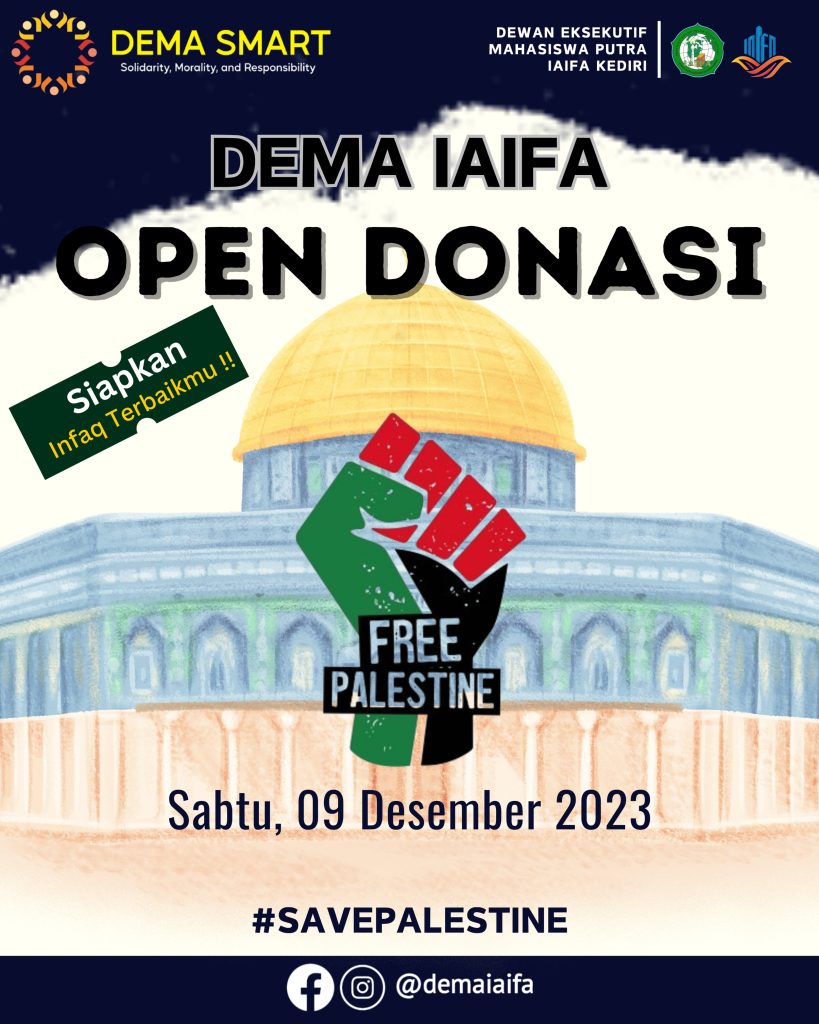 Kediri, Sabtu, 9 Desember 2023 – Institut Agama Islam Faqih Asy’ari (IAIFA) Kediri melalui Dewan Eksekutif Mahasiswa menggelar acara amal “Open Donasi Palestina dan Doa Bersama” sebagai wujud solidaritas dan dukungan kepada saudara-saudara kita di Palestina yang sedang mengalami situasi sulit. Acara ini direncanakan berlangsung di Kampus Putra IAIFA Kediri pada pukul 14.00 WIB. Open […]